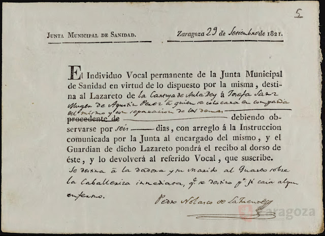 Recibo de ingreso en el lazareto de la Cartuja de Aula Dei para cuarentena durante la epimedia de cólera de 1821. Archivo Municipal de Zaragoza |