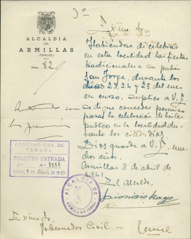 Este documento conservado en el Archivo Histórico Provincial de Teruel, pone de manifiesto que ya a principios de los años 40 se hacían actos típicos de fiestas populares para celebrar la festividad del santo patrón, como son los bailes públicos que se quieren celebrar durante varios días y para ello el alcalde pide autorización al Gobernador Civil.