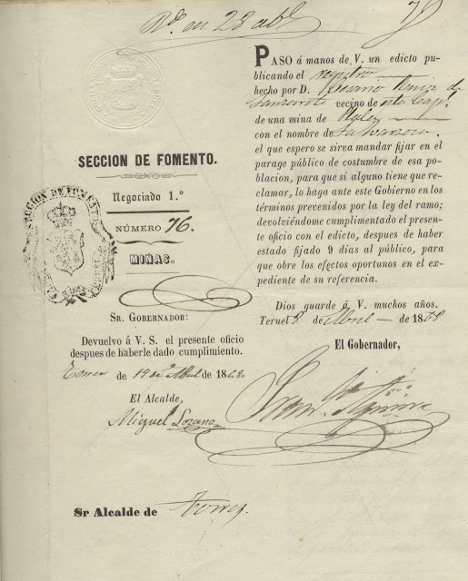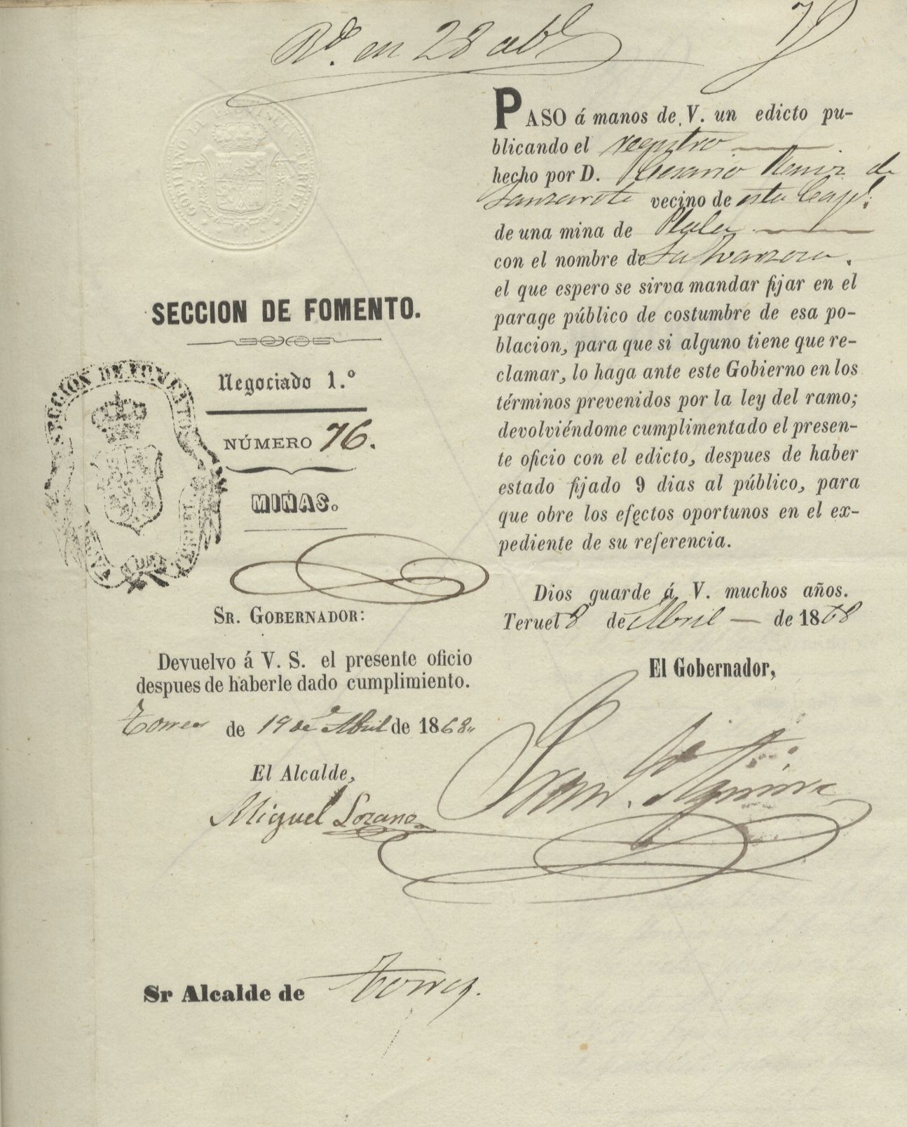 La Ley de Minas de 6 de julio de 1859 reformada por la Ley de 4 de marzo de 1868 establece la sustanciación de las solicitudes de registro ante el Gobernador Civil, quien una vez expedido el título de propiedad comisionará al alcalde respectivo para que ponga en posesión al interesado.