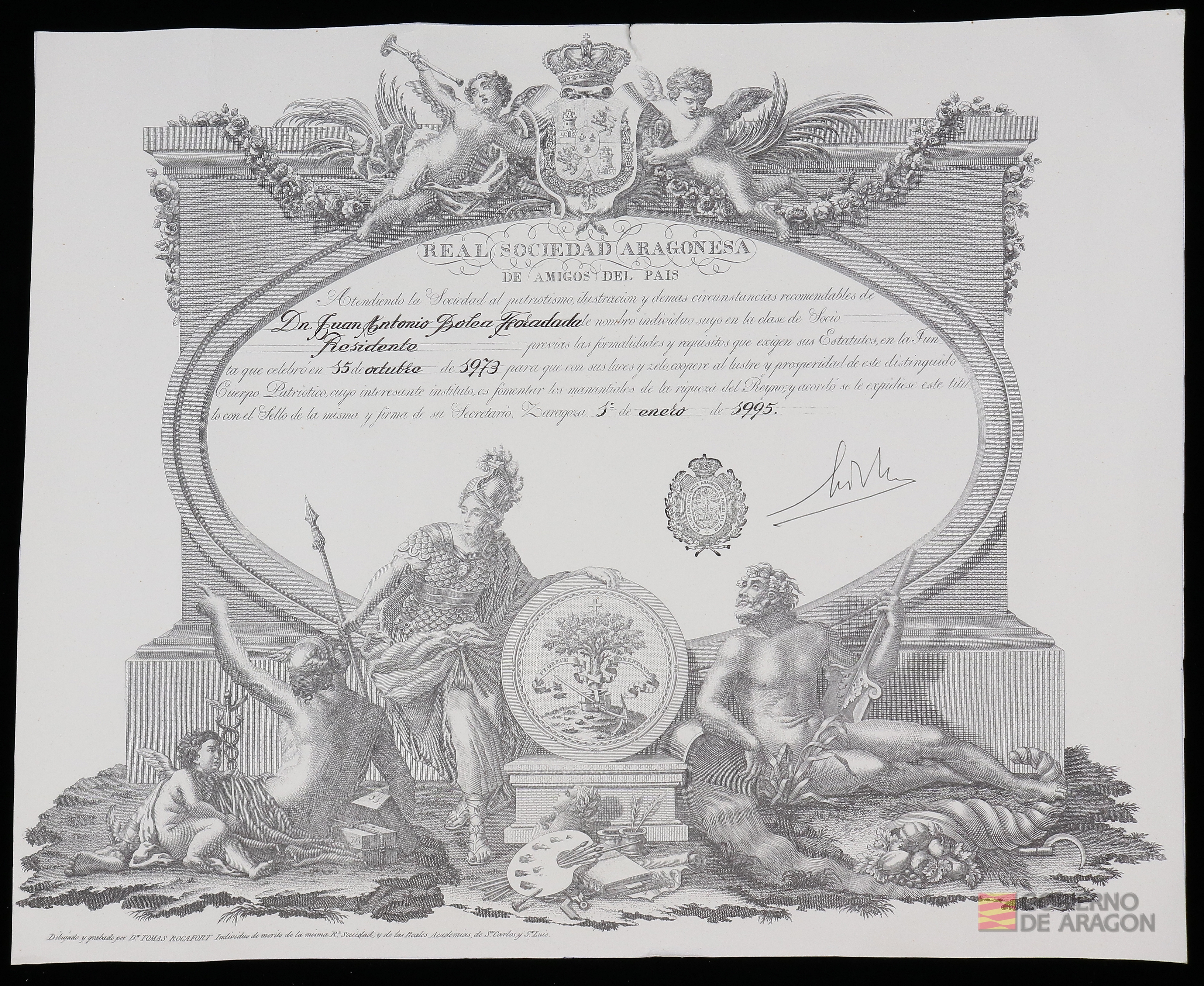 "Titulo de nombramiento como socio presidente" a D. Juan Antonio Bolea Foradada. Real Sociedad Aragonesa de Amigos del País