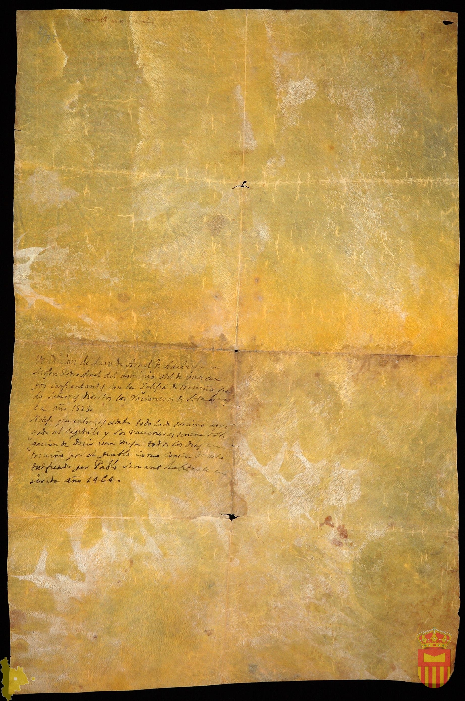 Carta de venta por la que Juan de Arnalt vende a Mossen Anton de Arnalt unos campos y un corral, con la obligación de pagar los diezmos a los racioneros de Treviño por mil sueldos jaqueses.