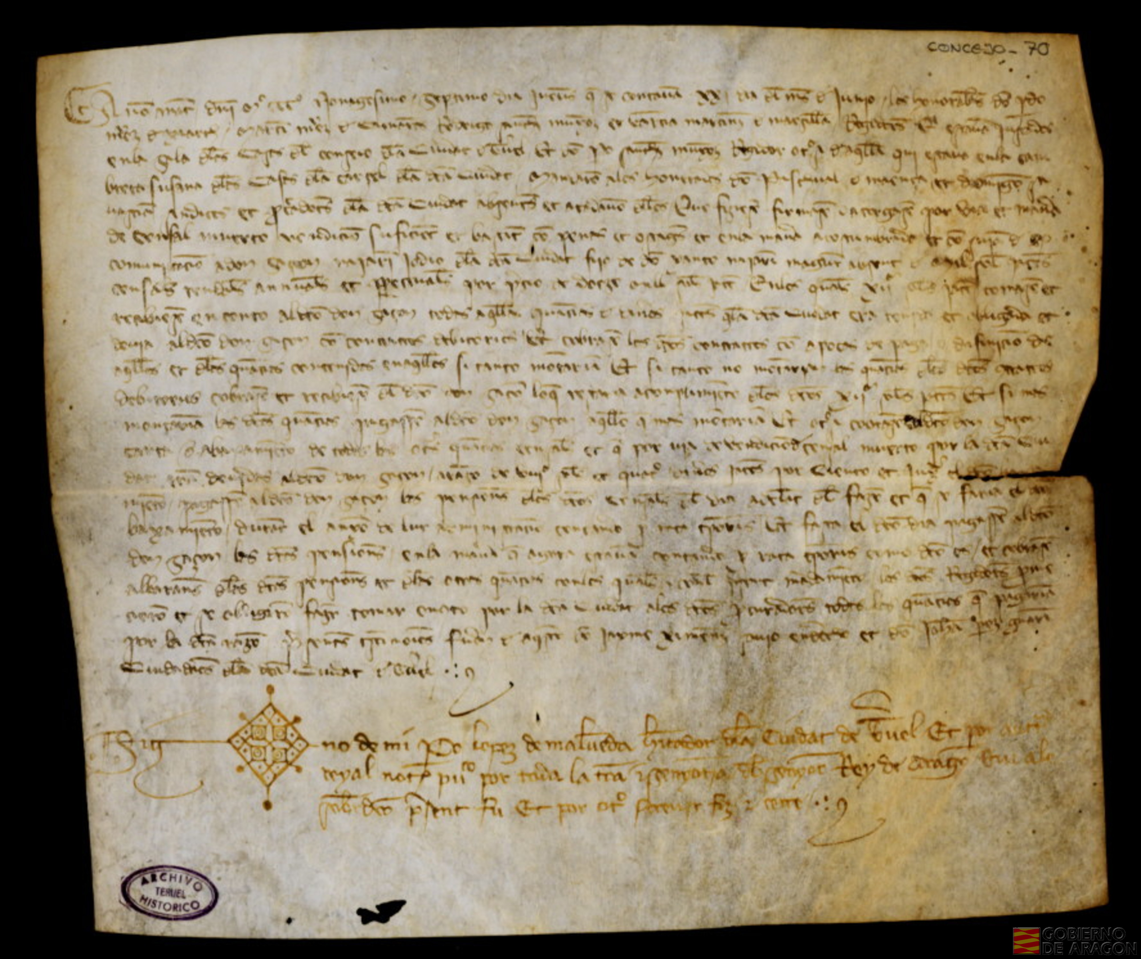Censal por el que los regidores de la ciudad y en nombre de la misma, aceptan doce mil sueldos jaqueses de un judío de Teruel, Sacón Najarín, hijo de Yanco Najarín, comprometiéndose al pago de un censo anual de mil sueldos jaqueses