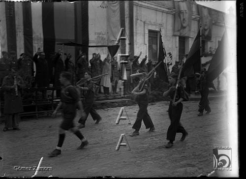 Chicos desfilando con uniforme y banderas falangistas. Mariano Gómez Zamora