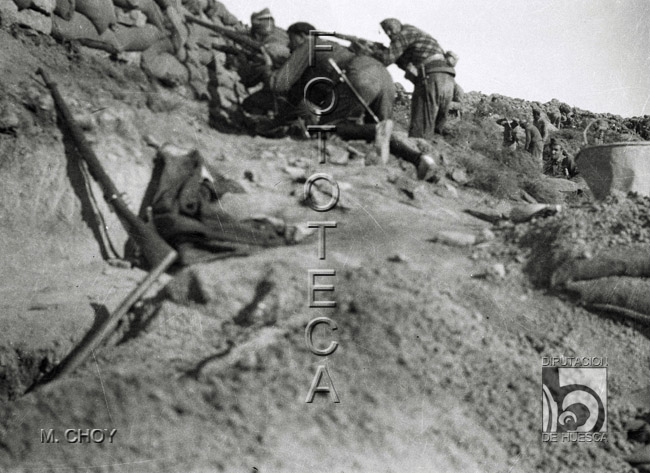 Guardias de asalto en el frente de Alcubierre : Soldados disparando desde la trinchera. Manuel Choy Llena. Alcubierre. Monegros
