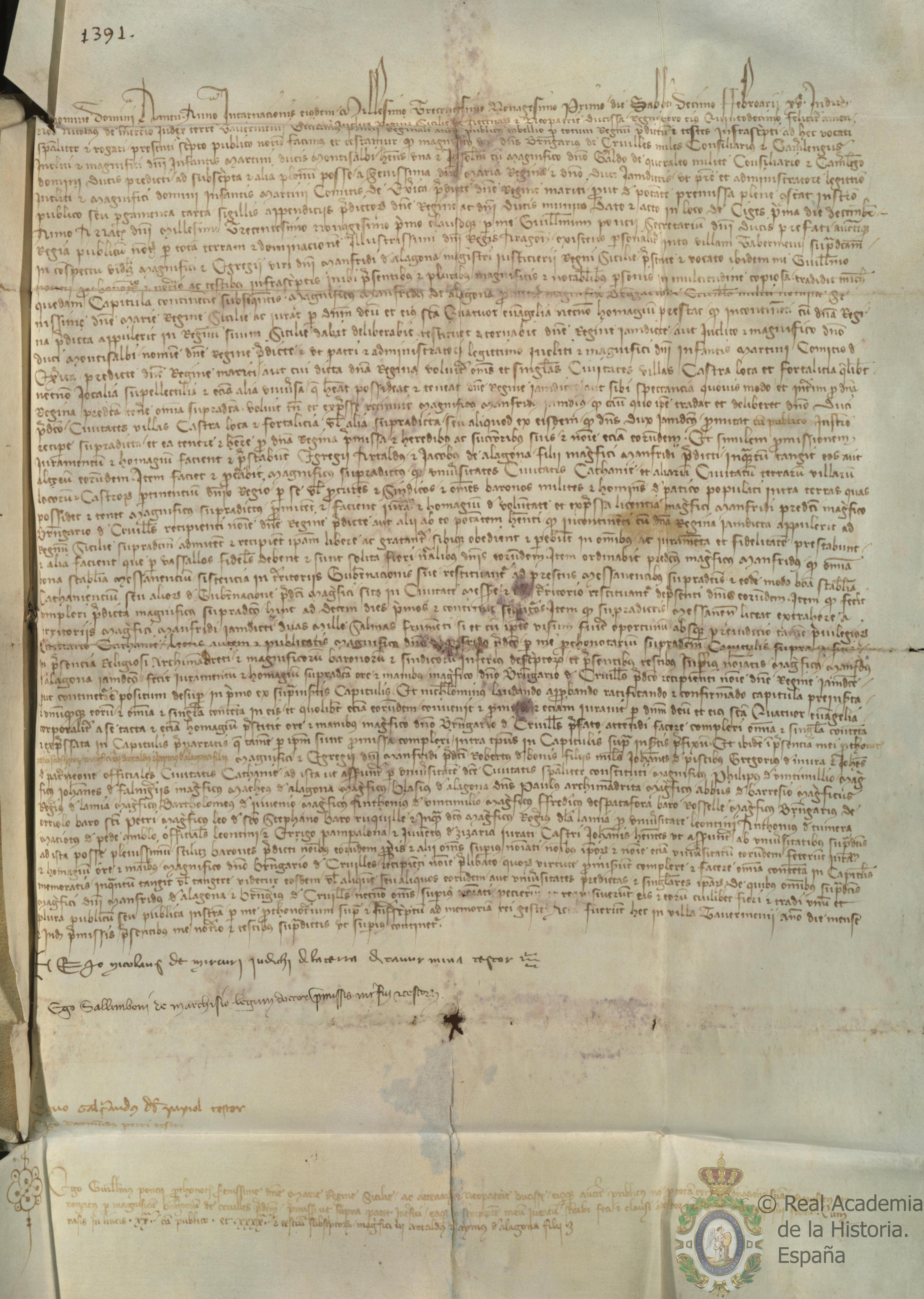 Homenaje y juramento de fidelidad prestado por Manfredo de Alagón, maestre justicier del reino de Sicilia, a Berenguer de Cruilles y Gueral de Queralt, consejeros y camarlengos de Martín, infante de Aragón y duque de Montblanc, como apoderados de María, reina de Sicilia, y del dicho Martín, en su propio nombre y como administrador de su hijo Martín, conde de Jérica, bajo ciertas condiciones