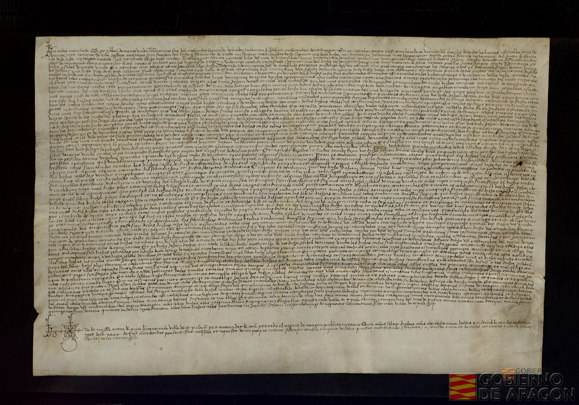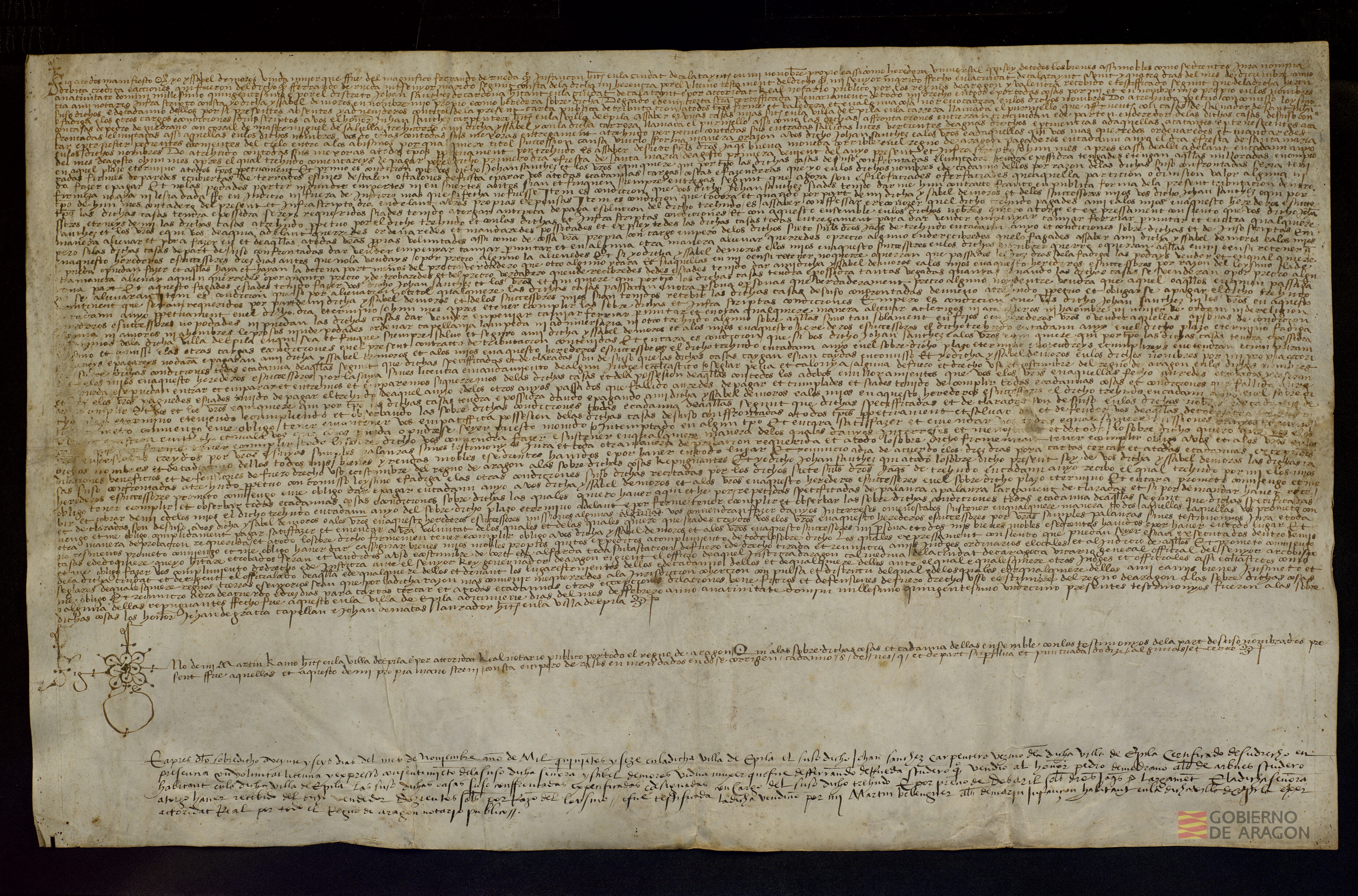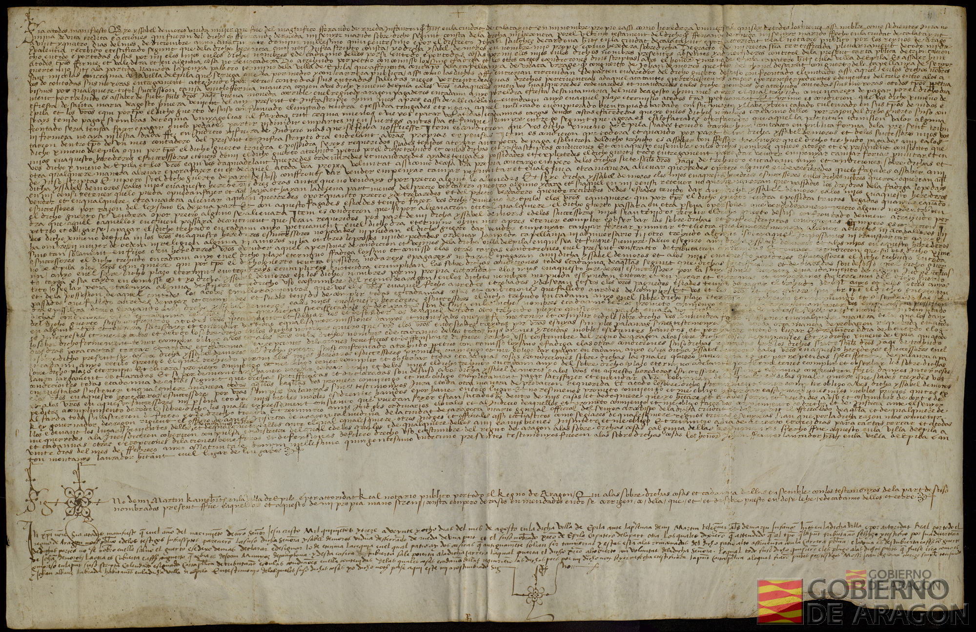 Isabel de Moros, viuda de Fernando de Rueda, infanzón habitante en Calatayud, de quien es heredera universal, entrega a Juan Sánchez, carpintero habitante en Épila, unas casas en dicha villa, por un treudo anual de 7 sueldos jaqueses