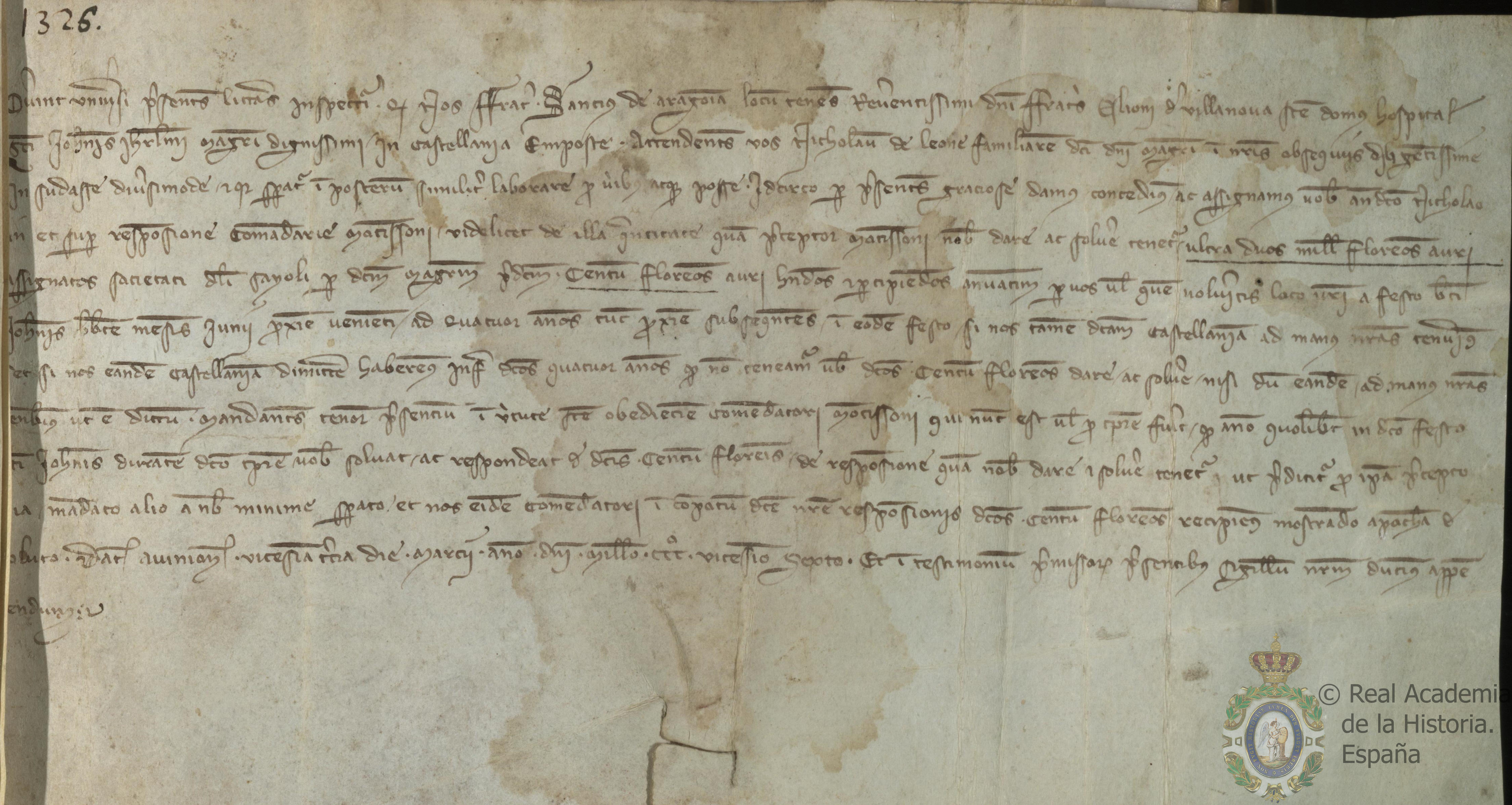 Sancho de Aragón, lugarteniente en la castellanía de Amposta de Elione de Villeneuve, maestre de la Orden del Hospital, concede graciosamente a Nicolás de Leone, familiar de dicho maestre, la percepción de 100 florines anuales durante cuatro años sobre los más de 2000 florines anuales en que le es tenida la encomienda de Monzón -que están asignados sobre la sociedad de los Sayoli por el dicho maestre- y así lo ordena a su comendador