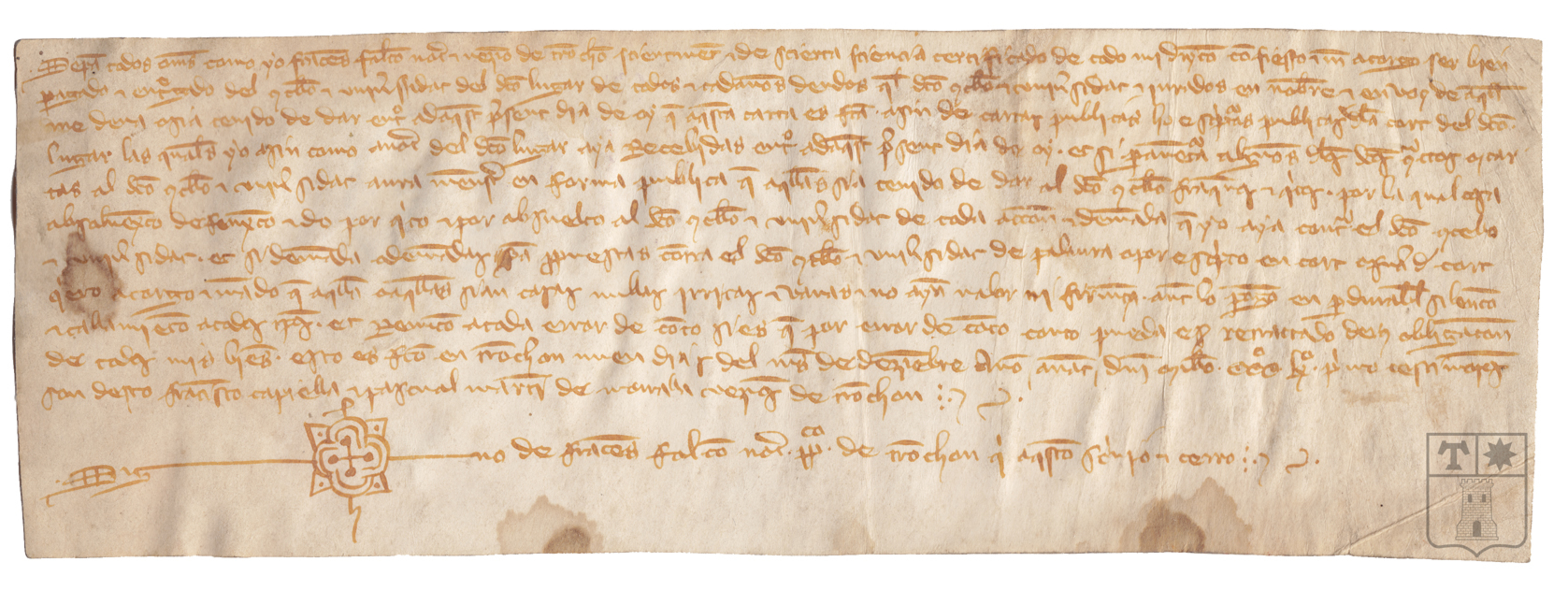 Apoca por la que Lope García de Urdáñez, de Alcañiz, y su mujer confiesan haber recibido de Francisco Falcón y otros representantes de Tronchón 6.000 sueldos
