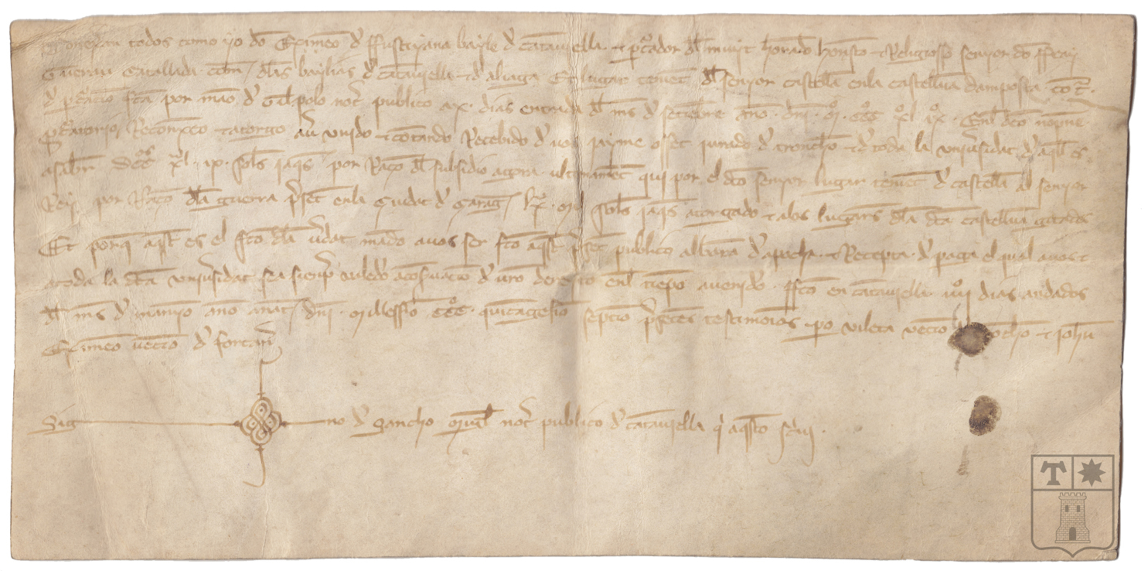 Albarán por el que Barnardo Carcases, vecino de Morella, como procurador de Pedro Tora confiesa haber recibido de Juan Florent 1.250 sueldos reales valencianos