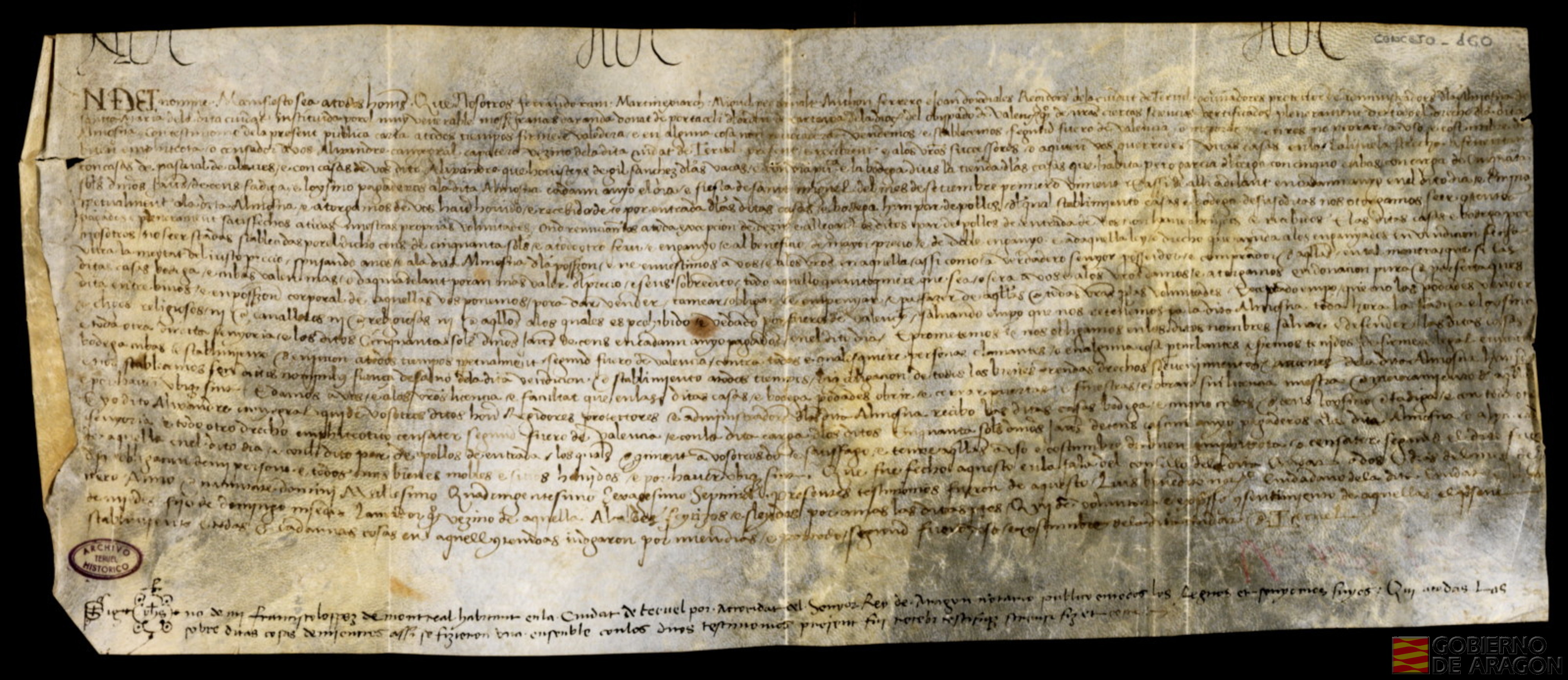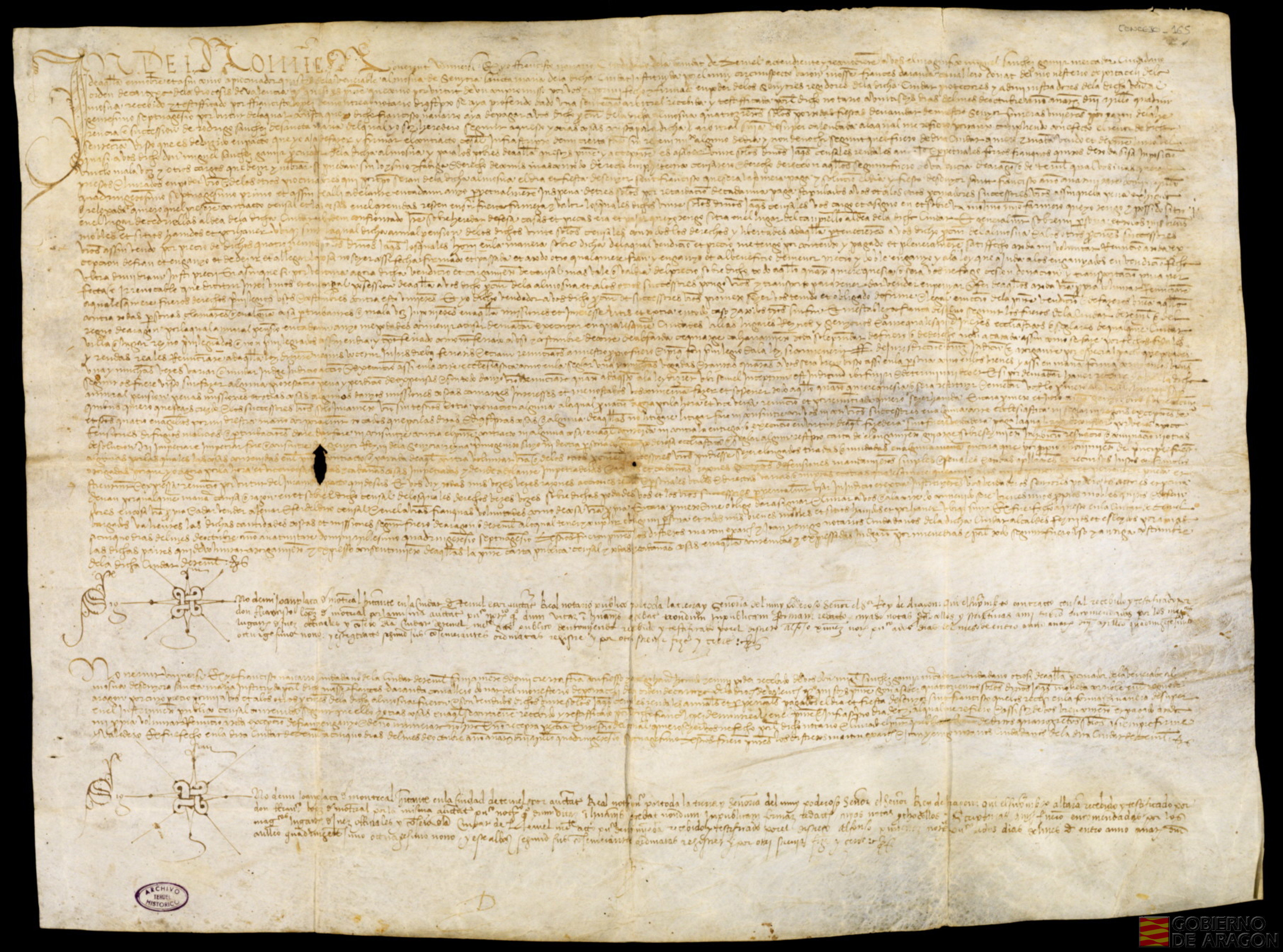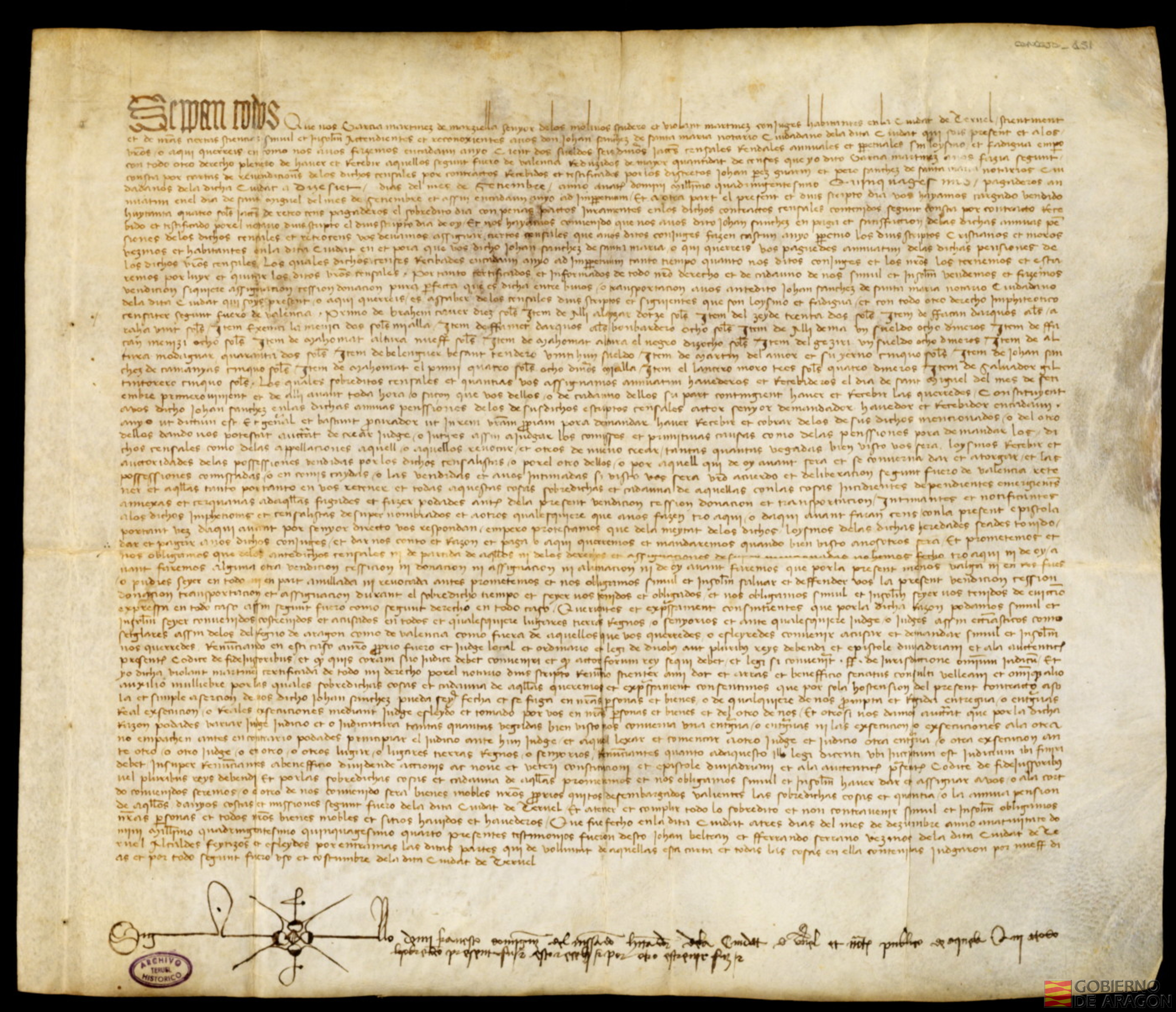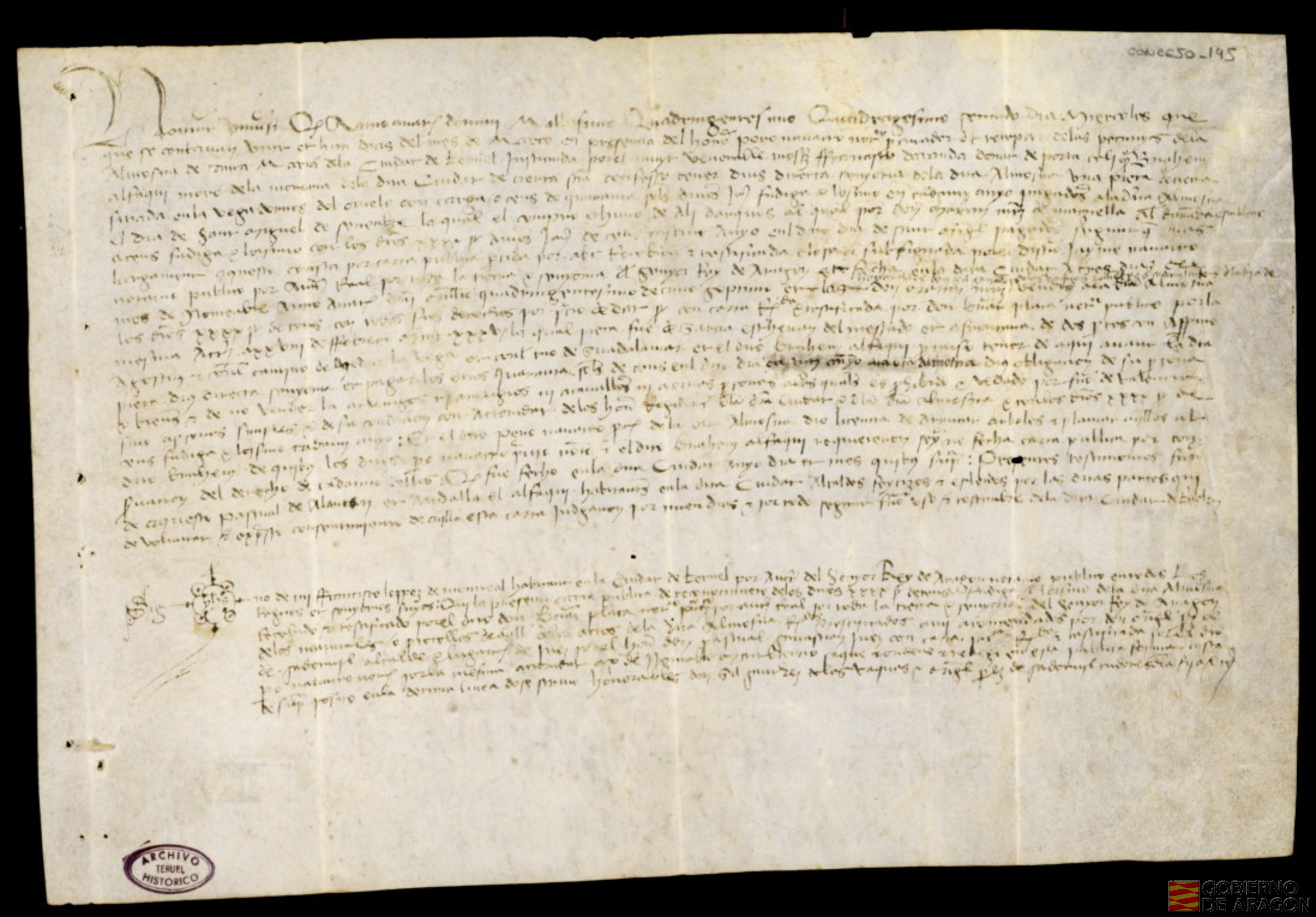 Censal por el que los regidores de la ciudad y en nombre de la misma, aceptan doce mil sueldos jaqueses de un judío de Teruel, Sacón Najarín, hijo de Yanco Najarín, comprometiéndose al pago de un censo anual de mil sueldos jaqueses