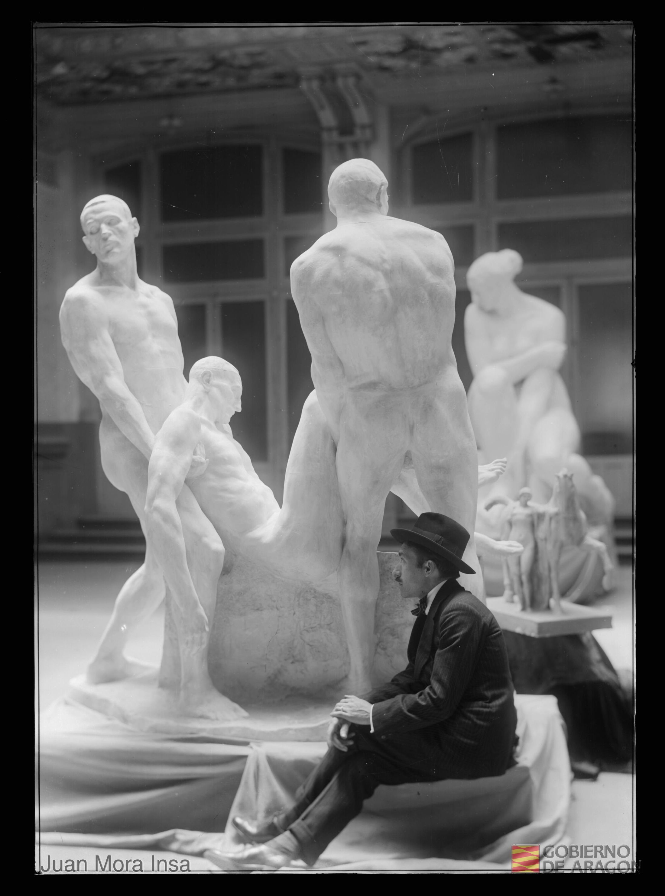 Grupos escultóricos funerarios, obra de José Bueno, sentado junto a ellos. Juan Mora Insa