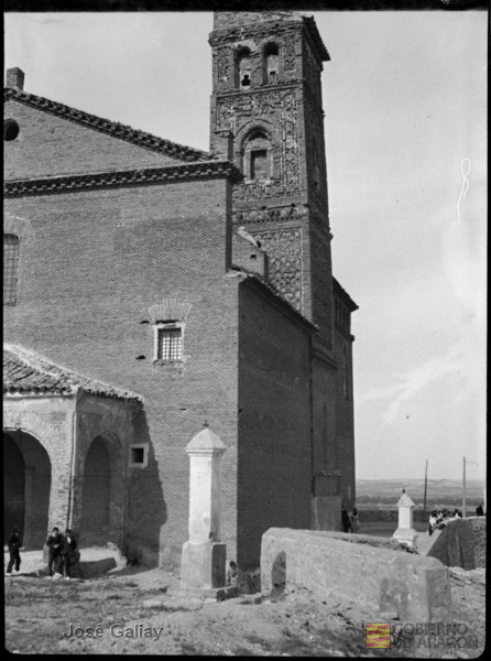 Quinto (Zaragoza). Iglesia parroquial de la Asunción. Torre mudéjar. Personas en la entrada. José Galiay Sarañana