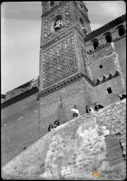 Quinto (Zaragoza). Iglesia parroquial de la Asunción. Torre mudéjar. Grupo de niños. José Galiay Sarañana