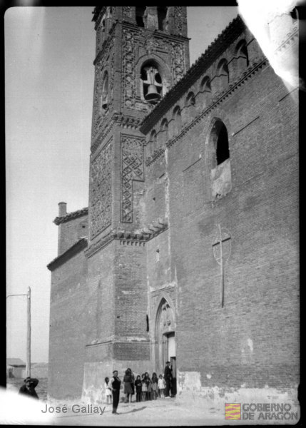 Quinto (Zaragoza). Iglesia parroquial de la Asunción. Torre mudéjar. Grupo de personas en la entrada. José Galiay Sarañana