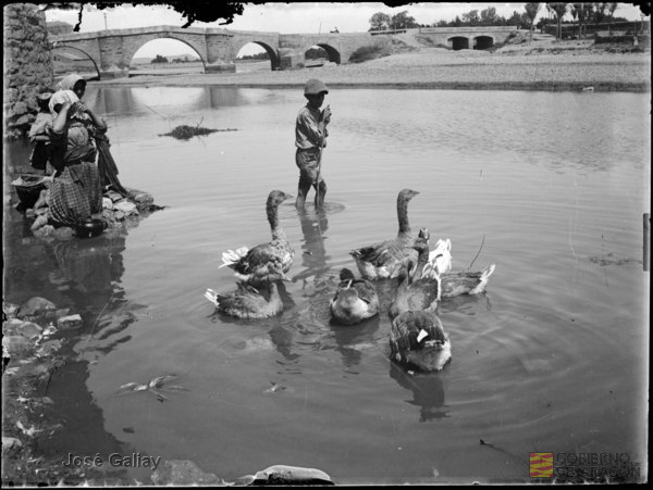 Ballobar (Huesca). Puente románico. Niño con ocas en el río. Mujeres lavando. José Galiay Sarañana