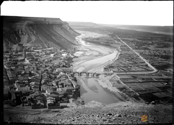 Ballobar (Huesca). Vista de la población, desde el monte. Río Alcanadre y puente. José Galiay Sarañana