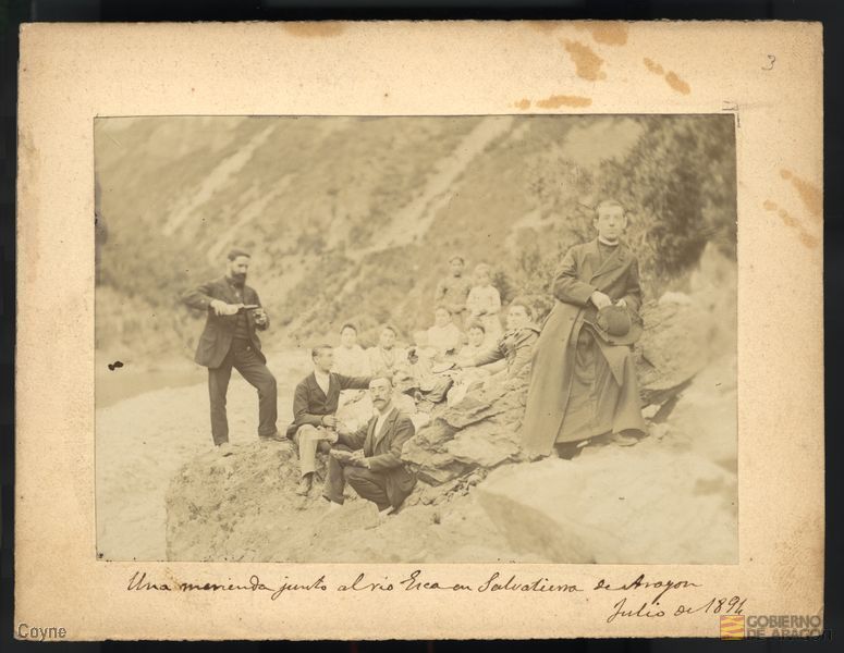 Grupo de personas merendando junto al rio Esca. Salvatierra de Esca