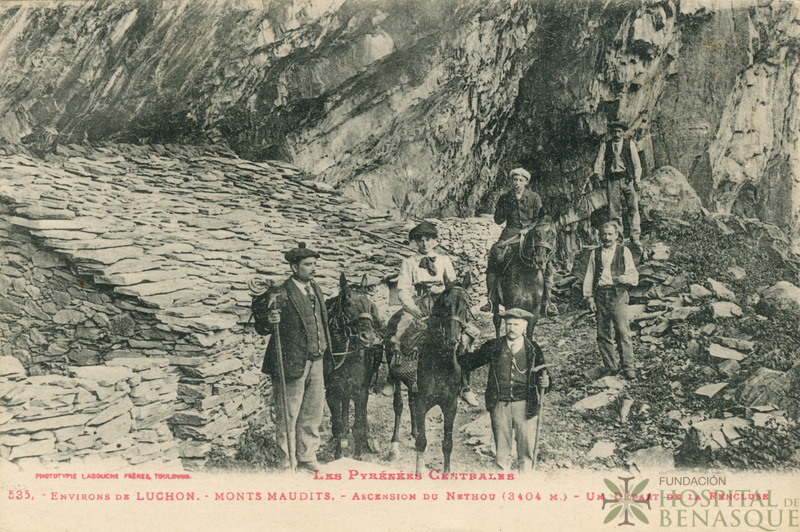 "Les Pyrénées Centrales (1ª série). 535. Environs de Luchon. Monts Maudits. Ascension de Nethou (3404 m). Un départ de la Renclusa. Phototypia Labouche Frères, Toulouse."
